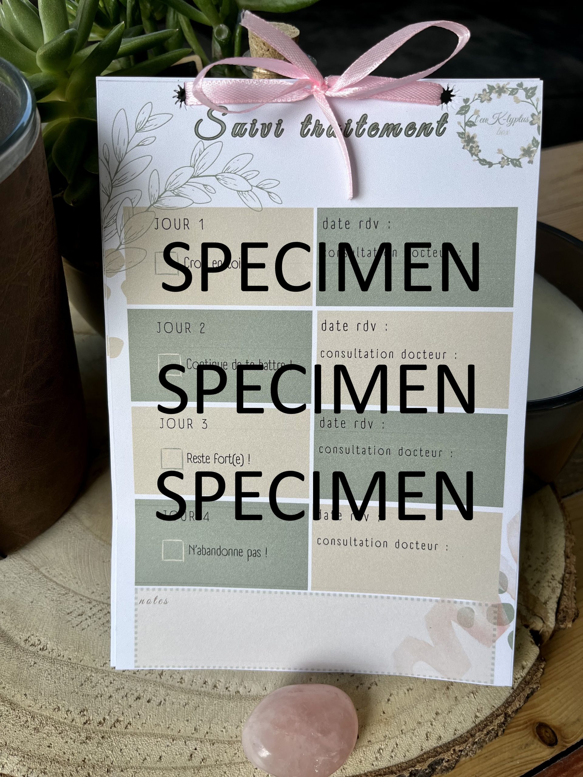 - un planificateur pour vos traitements de chimiothérapie. Ce support en papier est prévu pour vous aider à aller de l’avant. A chaque rdv de prévu, vous lirez une phrase good vibes pour vous booster. Au fur et à mesure des séances, les cases se cocheront et cela vous aidera à voir le chemin parcouru. Création artisanale française. Un espace est dédié pour noter ce que vous souhaitez retenir des échanges avec votre docteur. Un espace note en bas de chaque page est prévu pour noter ce que vous souhaitez (effets secondaires, à voir avec le docteur…)