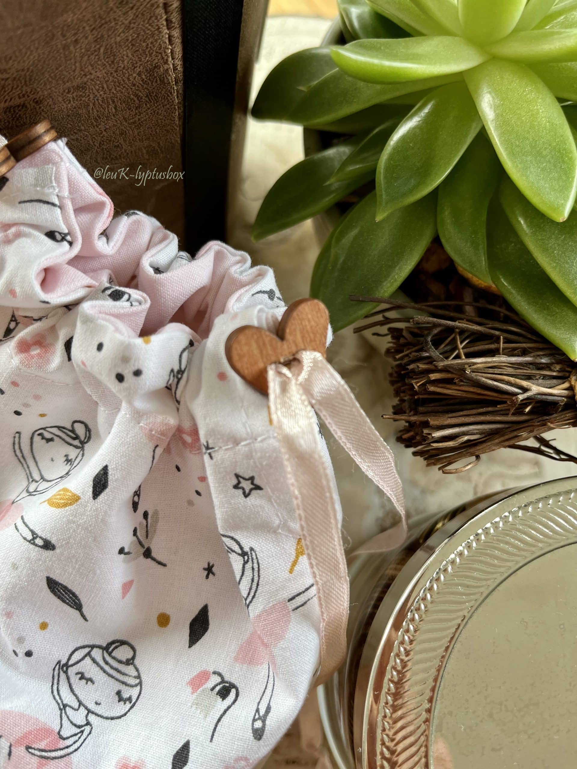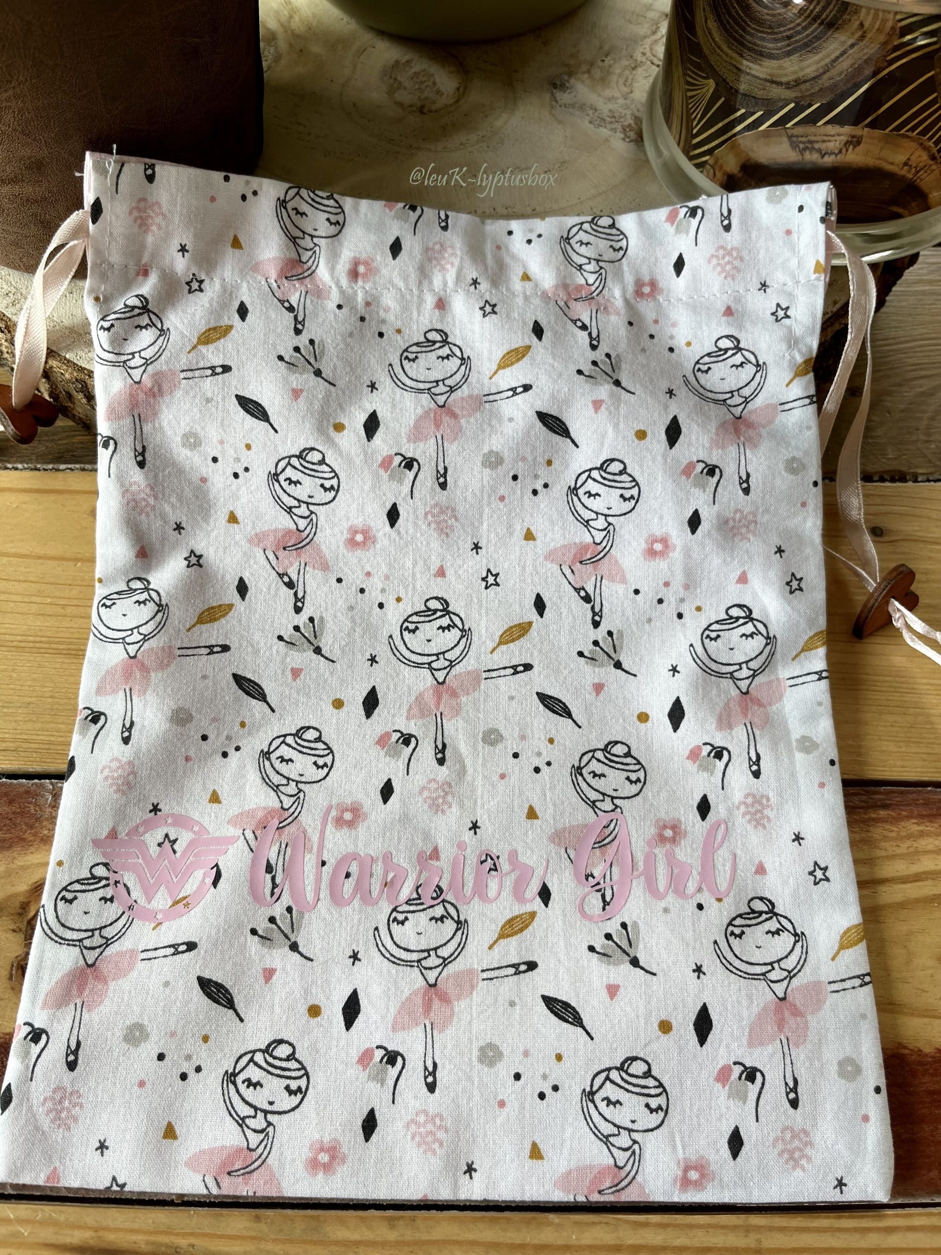 - un pochon en coton rose avec des danseuses et l’intérieur en coton rose uni. L’inscription « Warrior Girl » y est apposée pour donner encore plus de courage à une battante. Grâce à celui-ci, elle pourra emmener avec elle des bijoux, des vernis, un téléphone…plein de jolies choses :