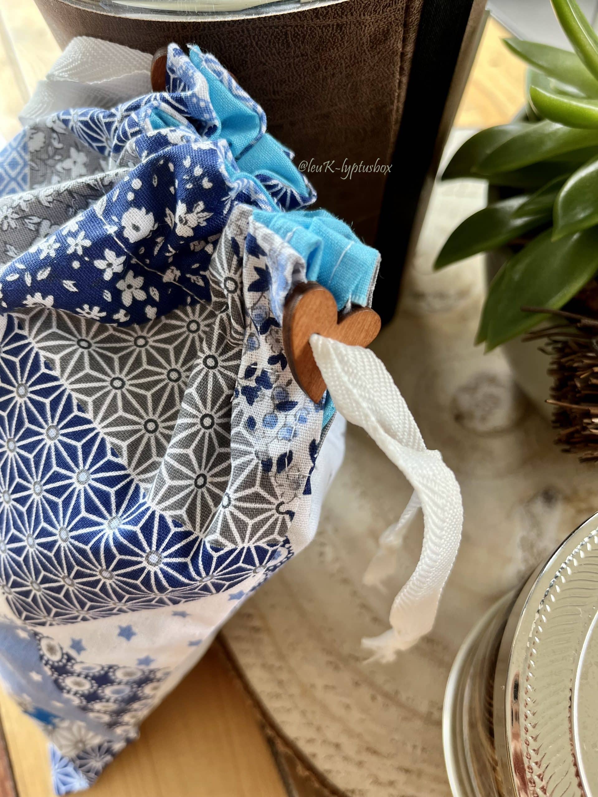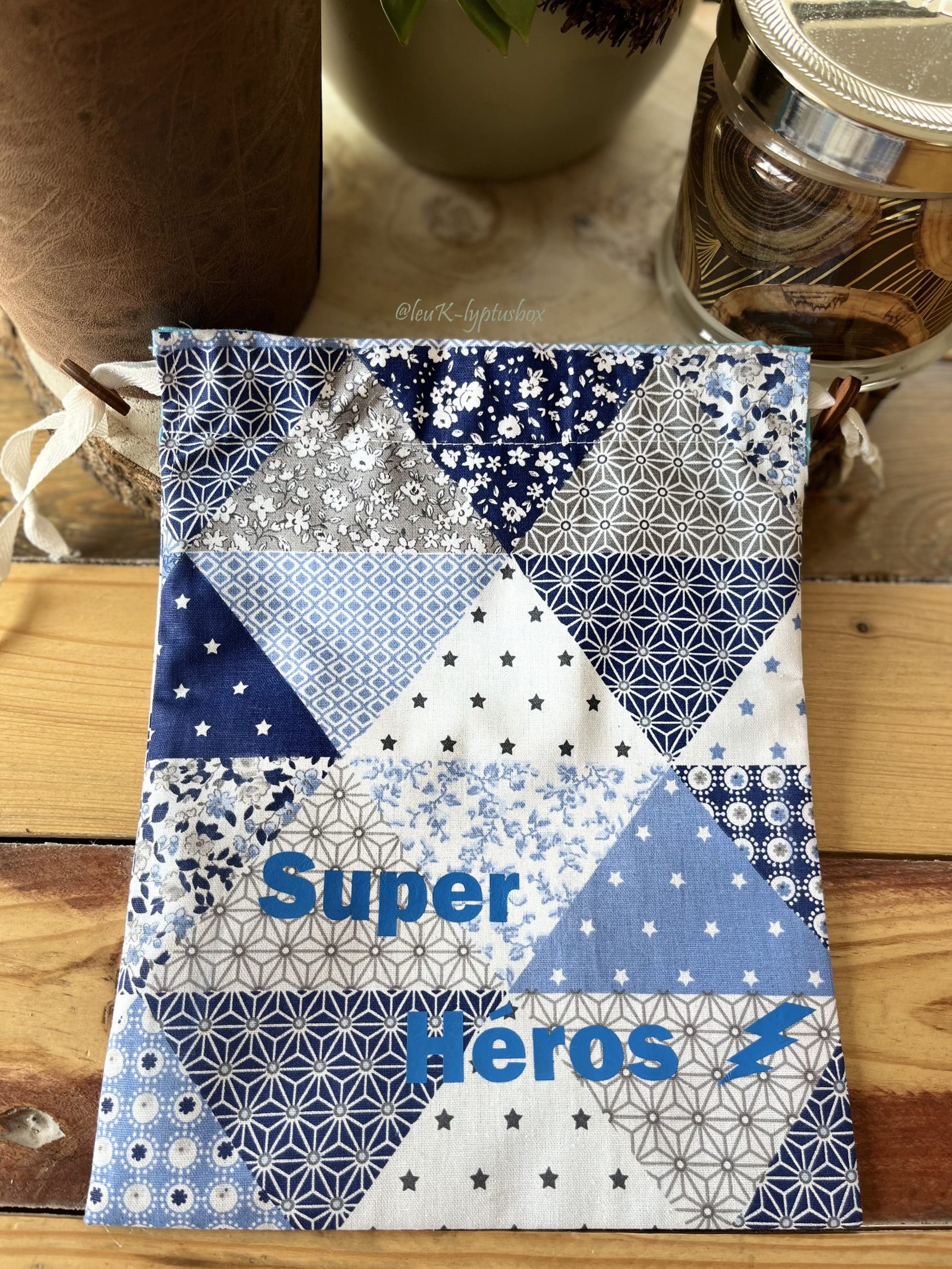 - un pochon en coton à motifs géométriques et intérieur uni turquoise. L’inscription « Super Héros » y est apposée pour soutenir l’enfant à trouver de la force. De cette façon, il pourra emmener avec lui des cartes, des écouteurs, un téléphone…plein de petites choses