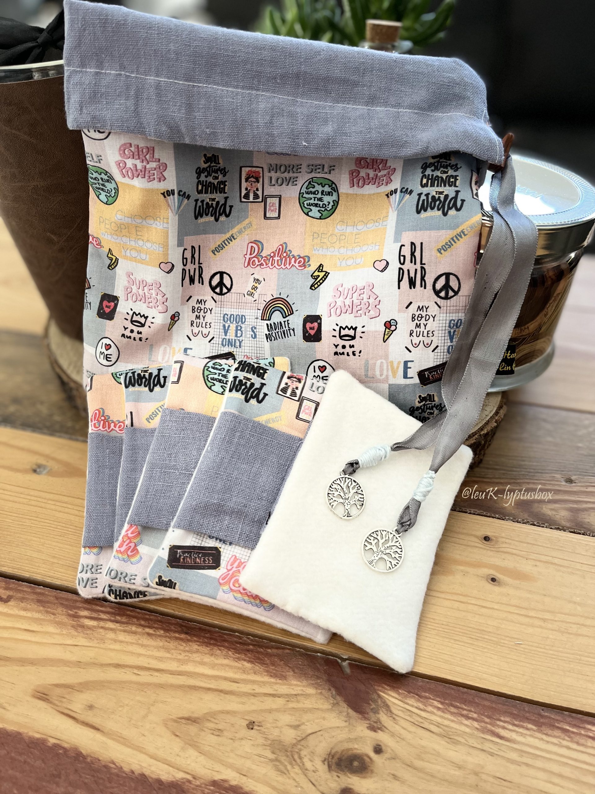 Proposé en lot de 5 avec pochon réversible assorti. Un côté imprimé avec des messages « good vibes » et l’autre en lin bleu, assorti aux poignées des lingettes.